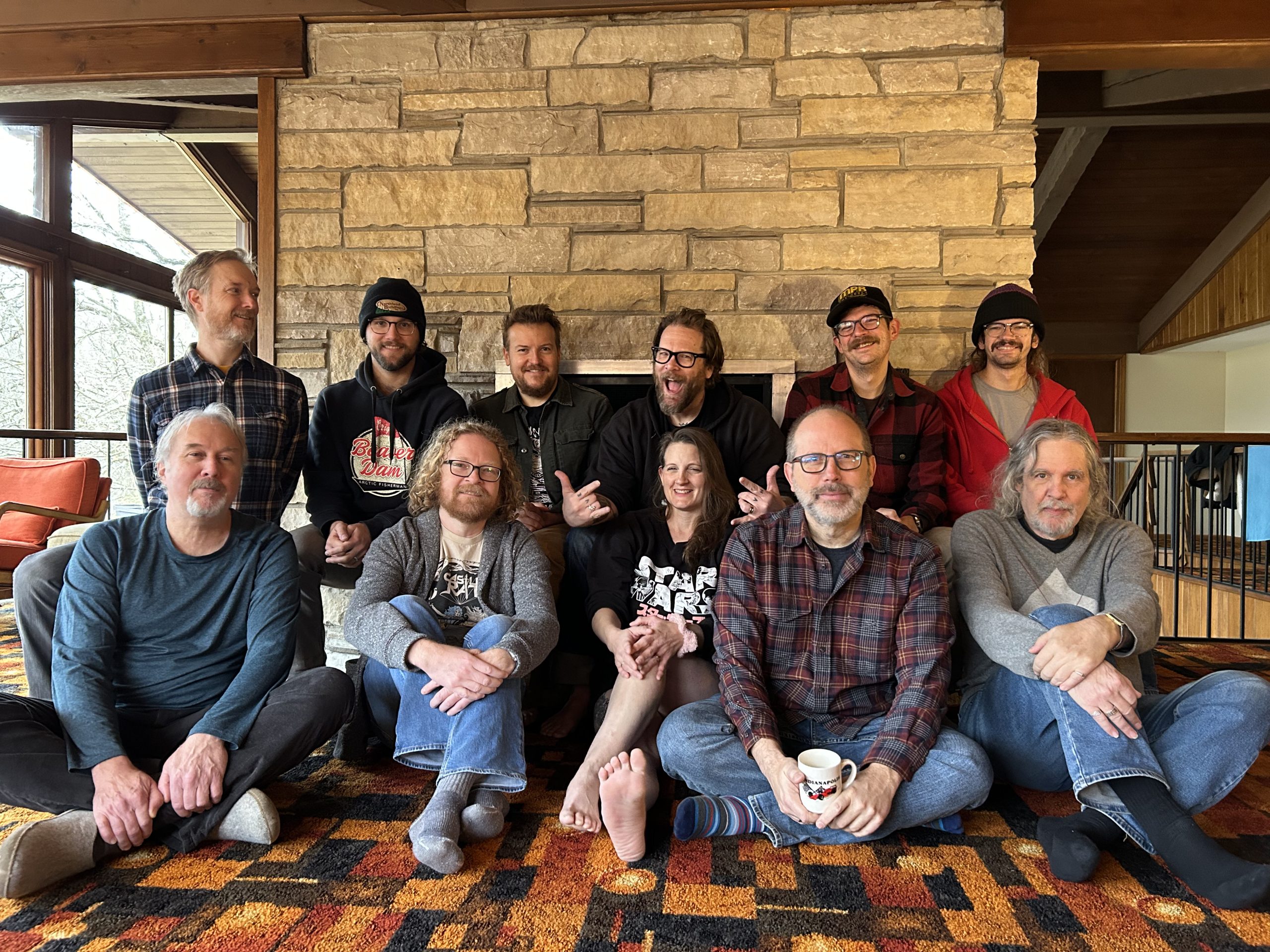 The Roe Family Singers at Pachyderm Studios in Cannon Falls, Minnesota, in November 2025. Top row from left: Pat Loftus, Jake Johnson, Adam Wirtzfeld, Quillan Roe, David Robinson, Brody Kucera. Bottom row from left: Steve Kaul (producer), David Gustafson, Kim Roe, Erik Brandt, Rich Rue. Photo: Mary Comfort.